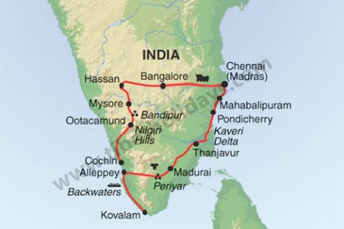 South India: A wonderful paradise for tourists to explore many dynasties showcasing different cultures, traditions, history and nature places. The pleasant Southern Part is most valuable treasure of India. Here the heritage of ancient India has a great impact on the culture, living, fair, festivals and traditional of South India people other than any religion of the country. This is marvel land of temples, monuments, historical places, ancient caves, huge gopurams (temples) covered by magnificent sculpture and God and Goddess in all 3 major tourist states of South India: Tamilnadu, Kerala and Karnataka. These are major tourist cities, undoubtedly enriched with magnificent ancient temples, historical monuments, forts and palaces, pilgrimages centre, Ayurveda, beaches, backwaters, rivers, wildlife, hill stations, adventure and major tourist cities and towns of all 3 states are: Chennai, Kanchipuram, Mahabalipuram, Trichy, Tanjore, Madurai, Hassan, Hampi, Mysore, Bangalore, Ooty, Cochin, Alleppy, Kovalam, Kanyakumari Periyar, Munnar and many more. All 3 states are well connected by air, rail and road. You can explore all these states in one tour. Here we are offering a tour covering the most popular destinations of South India.